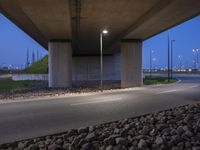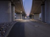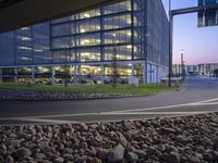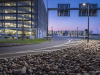 A reflection of the modern architecture of Berlin, Germany can be seen on a curving highway of cobble stone, asphalt, and concrete. Buildings of glass and metal line the thoroughfare, with trees and vegetation dotting the public space. The metropolitan area is illuminated by artificial light, creating a stunning blue ambience at night.