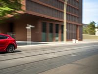 A mid-size car traveling down a road in the business district of Berlin, Germany on a clear day. The buildings in the background feature modern architecture and are made of wood siding, asphalt, and glass windows. The facade of the office buildings and houses reflect the automotive design of the land vehicle passing on the road surface.