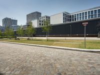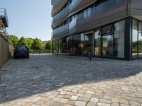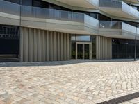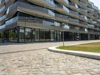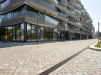 A modern, mixed-use building in Berlin, Germany, featuring a facade of glass and metal siding, lined with trees and open space. This residential property is part of the city's business district, with buildings of various designs, offering a variety of public and private spaces for the urban neighborhood.