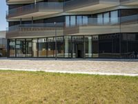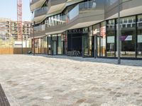 A modern, mixed-use property located in the business district of Berlin, Germany. The building, which houses offices, residential units, and public spaces, is surrounded by open space, cobblestones, and a clear sky. The facade is composed of glass, tiles, and walls, giving the building a unique profile in the city's urban design.