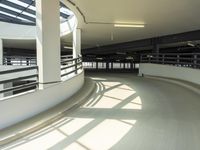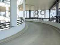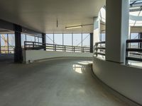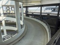 The interior of a modern building in Berlin, Germany features a white ceiling, glass windows, and a spiral staircase with a handrail and guard rail made from iron and steel. A concrete floor and flooring can be seen, and the building is a popular tourist attraction in Europe.