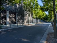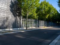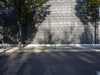 A stunning example of modern architecture in the vibrant city of Berlin, Germany. The sleek design and clean lines of this building stand out against the urban landscape. The natural light casts beautiful shadows on the brick wall, adding depth to the composition. The surrounding trees and greenery provide a serene contrast to the bustling city streets.