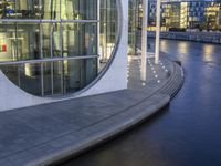 A stunning view of the modern architecture in Berlin, Germany, showcasing a building with a unique design, glass windows, and a handrail. The cityscape, reflecting on the river, adds to the urban ambiance of this metropolitan area in Europe.