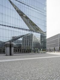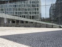 A cobble stone road is lined with a modern mixed-use building facade, glass wall, and Brutalist architecture design in the metropolitan urban area of Berlin, Germany. A fence and convention center provide a glimpse into the city life and urban design, while the sun casts hard shadows on the surfaces and glass.