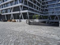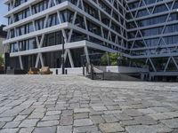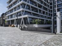 An aerial view of a mixed-use property in the city of Berlin, Germany. The facade features modern architecture with metal and steel surfaces, low buildings, cobble stone driveways, and a blend of vegetation and urban design. The clear sky gives a perfect view of the business district and office buildings. A perfect example of the perfect combination of modern and urban design.