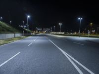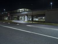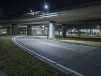 A view of the city of Berlin at night, with modern architecture, an underpass, trees, grass and concrete along the roadway, illuminated by artificial light, providing a glimpse into the metropolitan area and its infrastructure.