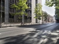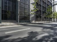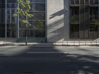 A sunny day in Berlin reveals a stunning view of modern architecture, city life, and infrastructure with an office building, house, and yellow line on the road surface, surrounded by trees and a fence in the foreground.