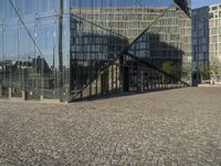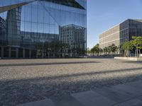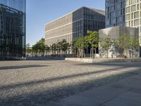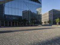 A cobble stone plaza and modern architecture in the center of Berlin, Germany. A clear sky reveals the yellow leaves of a tree, a glass wall, and a metal office building in the background. The urban design of the metropolitan area showcases a mixed-use of condominiums, business districts, and public spaces. The concrete, grass, and pavement of the foreground add to the city life of this bustling town.