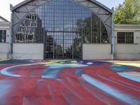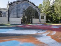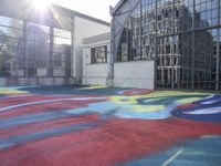 A clear sky day reveals a modern architectural landscape of Berlin, Germany. From the metal and glass facades of warehouses and galleries to the concrete and graffiti walls of courtyards and urban design, the city is alive with multicolored tints and shades. A line of trees, the reflection of the sun on the asphalt, and the property of a residential area, provide a leisurely contrast to the bustling infrastructure of the city.