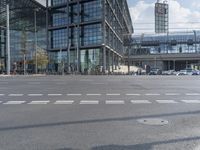 A view of the modern architecture and urban design in Berlin, Germany. The city's central station can be seen in the background, surrounded by high-rise buildings and residential areas. The picture captures the bustling street with vehicles, pedestrians, and a zebra crossing.