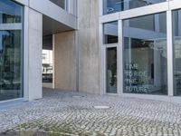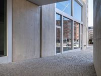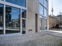 A composite material facade of a modern office building in the business district of Berlin, Germany. The cityscape is composed of grey concrete and cobble stone roads, with snow-covered trees and vegetation in the surrounding residential area. The building features a rectangular profile, with a wooden door and glass fixtures, and tints and shades of brick wall. The clear sky and urban design adds to the vibrant city life of the financial district.