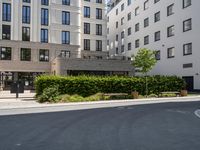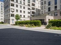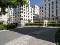 A cobble stone alley-way in Berlin, Germany, showing the modern architecture of a high-rise condominium and other residential properties with nature scattered among the urban design. The clear sky casts a hard shadow on the brickwork, asphalt road surface, and outdoor fixtures, with vegetation, trees, and shrubs adding tints and shades.