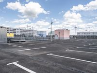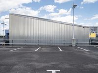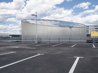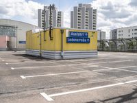 A view of a modern concrete street in Berlin, Germany, with a parking garage, parking deck, and a residential area in the background. A cloudy day brings a unique atmosphere to the urban landscape featuring asphalt, tar, street lights, a road surface, and a bridge in the distance.