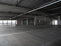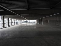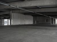 A composite material of concrete, asphalt, wood, monochromatic tints and shades, and other materials come together to form the modern architecture of Berlin, Germany. The day sky is visible from the parking deck, with a view of the urban street below. The urban design, style, and infrastructure come alive in this metropolitan area, providing an elevated view of the city life and public spaces.