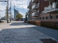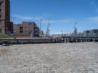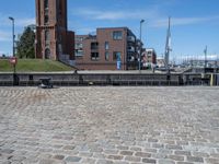 A city street featuring a modern tower, a residential area, and a harbor with a boat in the foreground, all beneath a clear sky in the city of Bremen, Germany. The street is made up of cobblestone and asphalt with street lights and vegetation lined along the road.