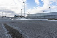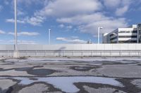 A stunning view of a modern architecture building in a Canadian city, showcasing its open space design and sleek facade, against a backdrop of snow-covered streets and a grey sky.