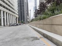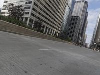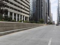 A view of the downtown Chicago skyline with its modern architecture, residential area, public spaces, and infrastructure, with the Armco barrier running straight down the road, on a sunny day.