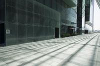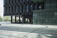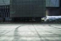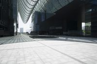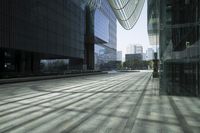 A stunning view of a modern architecture building in the bustling city of Zhuzhou, Jiangsu, China. The glass walls and unique structure reflect the vibrant metropolitan area, while the open plaza and courtyard provide a peaceful public space for residents and visitors alike. The straight road surface and walkway lead straight down the road, lined with skyscrapers and corporate headquarters. The cityscape and skyline create an abstract backdrop, with the hard shadows and reflections adding depth to the architectural profile. The asphalt road and glass storefronts contribute to the urban design, while the water feature and greenery add a touch of nature to the bustling cityscape.