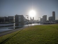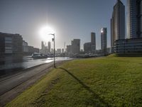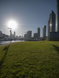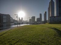 A stunning view of a modern city skyline at dawn, with skyscrapers, office buildings, and green grass in the foreground.