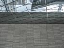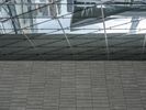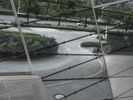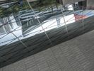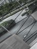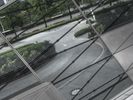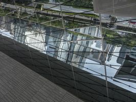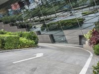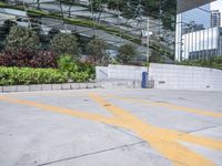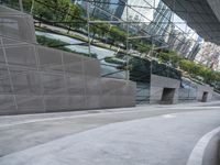 A street in an urban area featuring both modern architecture and elements of nature. Buildings of various heights, handrails, concrete and asphalt roads, glass and metal walls, parking lots, and vegetation are all visible in this metropolitan cityscape.