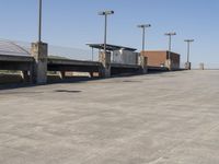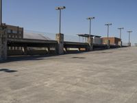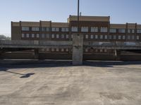 A view of a modern office building surrounded by concrete and asphalt in a bustling city.