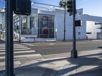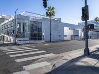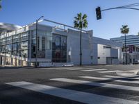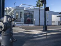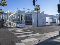 A stunning view of a modern office building and storefronts in the bustling city of Los Angeles, California, USA.