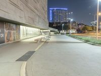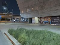 A view of the modern architecture of a business district in Dallas, Texas, illuminated by street lights, artificial light, and the night sky. Concrete, asphalt, cement, glass, metal, and other materials create a unique urban landscape, with buildings, glass walls, storefronts, and public spaces illuminated by the low light.