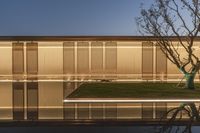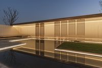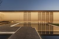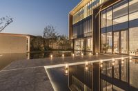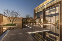 A stunning view of modern architecture at dawn in the city, with the reflection of the buildings on the water.