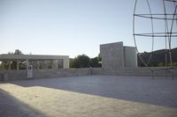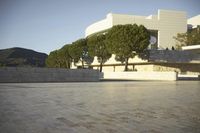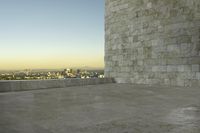 A stunning view of modern architecture in the city of Los Angeles, California, USA at dawn. The concrete building with open spaces and sleek lines stands out against the clear sky and cityscape, offering an overview of the urban horizon.