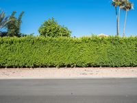 A typical suburban residential street in Palm Springs, California, USA, on a clear day. The mid century modern architecture is framed by lush greenery, and the asphalt road leads into the Sonora Desert.