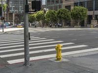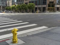 A view of a modern office building with yellow windows and a line of trees along the road in downtown Los Angeles, California, USA.