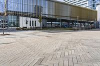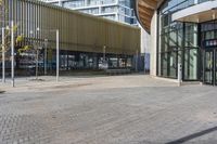 a large building that has a large glass window near it's entrance to a city