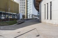an empty parking lot with benches and wooden posts in front of it in front of tall buildings