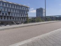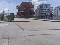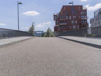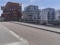 A residential neighborhood in Frankfurt, Germany featuring modern architecture, public spaces, and a mix of corporate headquarters and office buildings surrounded by a fence, guard rail, and handrail. Asphalt roads and pathways are visible, with a bridge in the distance and contrails in the clear sky above.