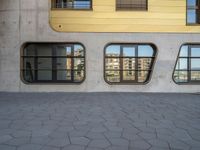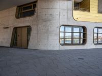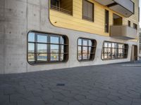 This photo showcases the modern architecture and urban design of a residential area in a German city. The clear sky and hard shadows highlight the sleek lines and concrete walls of the buildings. The paver surface and urban atmosphere add to the dynamic feel of the scene.
