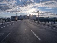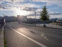 Berlin, Germany is a city of modern architecture, city life, and business. On this day, the sun is visible and the skyline is highlighted by the early morning light. Asphalt roads, vegetation, and mountain landforms line the horizon, while office buildings and streetlamps illuminate the thoroughfare.