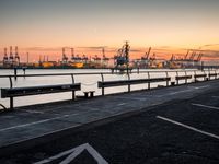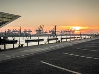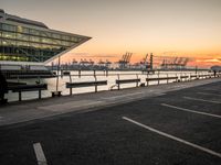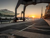 The sun rises over the modern architecture of Hamburg, Germany, as a jetty and pier line the harbor's waters near a landing and asphalt road.