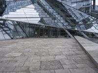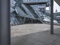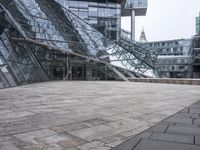 A view of the futuristic Brutalist architecture of a business district in Hannover, Germany. The monochromatic view of the metallic and concrete facade, the flooring, and the open space creates a unique urban design that stands out against the grey sky.