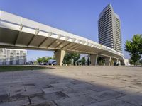 A low-angle shot of a modern architecture building in Zaragoza, Spain. The open space and lush green trees provide a refreshing view on a sunny day. The high-rise building and the line of composite material infrastructure create a striking urban design. The clear sky adds to the overall appeal of this office building in the financial district of Europe.