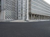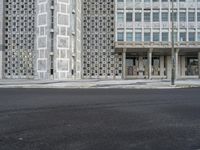 A modern high-rise building and its facade is illuminated by the sun in Lisbon, Portugal. The building is made of composite materials and has a grey profile. The asphalt surface of the thoroughfare below is lined with a public space, a museum, and a condominium. Flooring and windows complete the urban design.