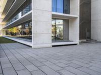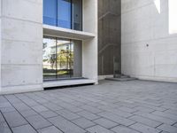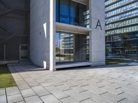 A view of a residential area in the business district of Lisbon, Portugal. The modern architecture is characterized by a composite material facade, a high-rise office building, wood doors, and a paved open space with a grey asphalt road surface and vegetation.