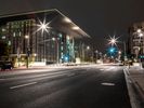 A stunning office building with a sleek glass facade and symmetrical design, illuminated by artificial light at night in the business district of Long Beach, California, USA.