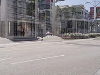 A view of a modern architecture building in Los Angeles, California, USA, surrounded by a vibrant cityscape. The building's sleek facade and large windows reflect the urban design of the neighborhood. The busy road with asphalt and road surface is lined with automobiles and vegetation, while shops and storefronts add to the vibrant urban atmosphere.