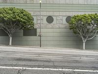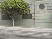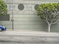A view of a modern architecture building in Los Angeles, California, USA. The city's urban design and infrastructure can be seen in the background, with a road surface and asphalt leading to the building. The building features large windows and a wooden facade, blending with the surrounding vegetation and trees. The vibrant yellow lines on the road add a pop of color to the urban neighborhood.