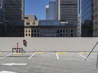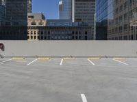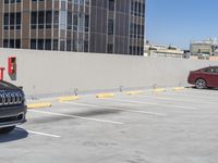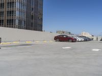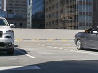 The modern architecture of the downtown business district in Los Angeles, California is illuminated by the clear sky. Automobiles and air planes can be seen in the foreground, while the cityscape is composed of high-rise towers, office buildings, and a parking deck. The concrete street is lined with parking lots and curbs, and the asphalt and composite surfaces of the thoroughfare complete the urban design.
