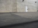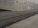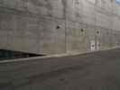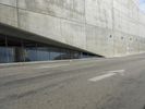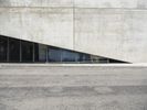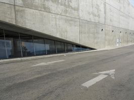 A low angle shot of the modern architecture, concrete bridge, and building facades in Los Angeles, California, USA. The straight down the road view highlights the open space, roof lines, arch bridge, and wall structures. A clear sky and parking lot are visible in the background.