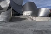 A corporate headquarters in Los Angeles, California, USA, showcasing modern architecture featuring a mix of concrete, asphalt, wall, floor and roof materials, along with an open space, plaza, courtyard, walkway, road surface and paver surfaces, on a clear day with contrails in the sky.