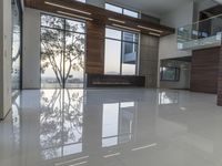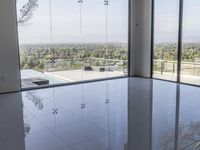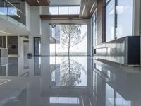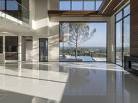 A view of modern architecture and design in Los Angeles, California, USA. The building features an open interior space with water, window, floor, glass, door, reflection, room, villa, concrete, surface, clear sky, design, paver, nature, tree, flooring, tile, lake, handrail, recreational, material property, automotive exterior, office building, and sun visible straight down the road.