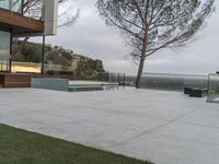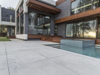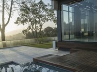 A view of a modern villa in Los Angeles, California, USA. The backyard features a concrete patio, hardwood flooring, grass lawn, and trees. The house is illuminated by the sun in the early dawn, with a reflection on the pool and glass facade.