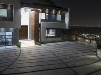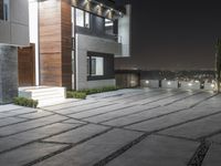 A high-rise building stands illuminated at night in the residential area of Los Angeles, California. The facade features a combination of materials including concrete, tile, siding, and artificial light. The open space includes a tree, room, window, paver, and parking garage. The elevated view shows the roof, floor, road surface, and other elements of this modern architecture.